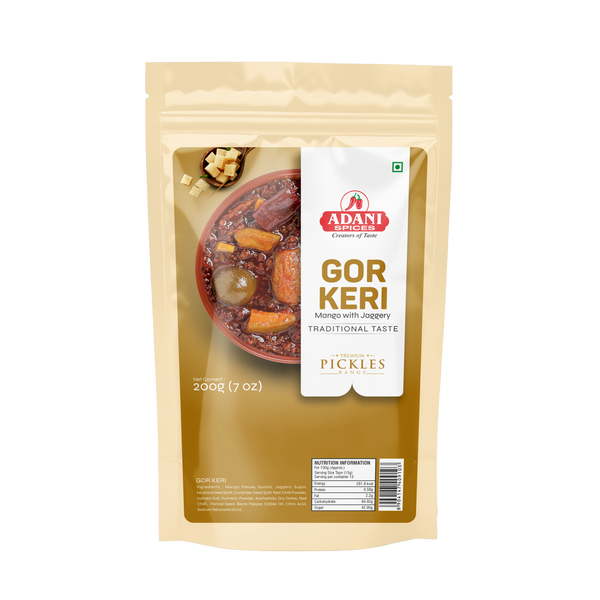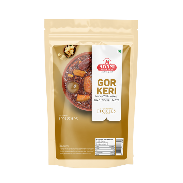 - Ingredients: Mango, Gunda, Jaggery, Sugar, Mustard Splits, Coriander Splits, Red Chilli, Iodized Salt, Turmeric, Asafoetida, Fennel Seeds, Black Pepper, Edible Oil, Citric Acid