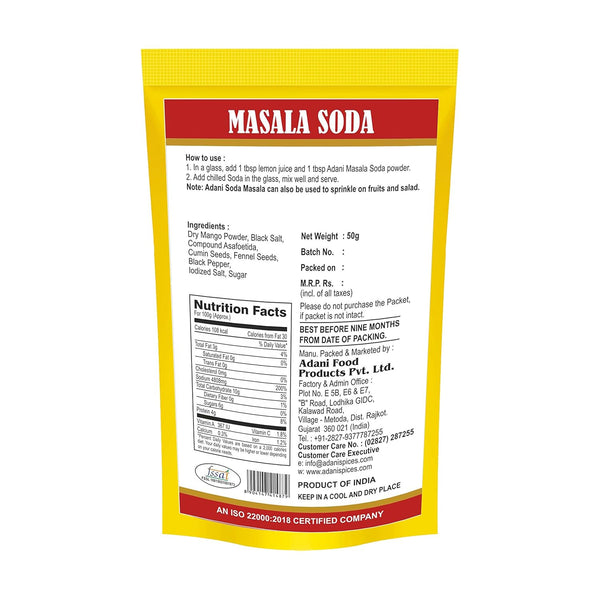 - How to use: 1) In a glass, add 1 tbsp lemon juice & 1 tbsp Adani Masala Soda Powder. 2) Add Chilled Soda to the glass, mix well & serve.