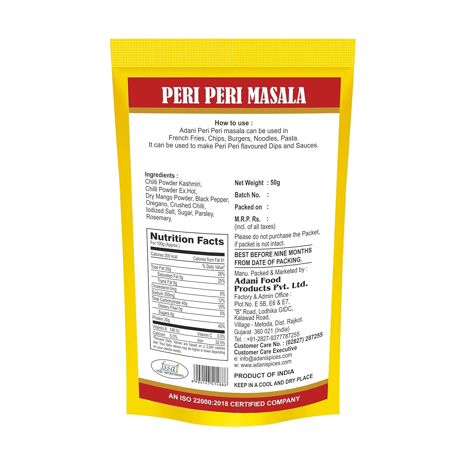 - Uses: Adani Spices Peri Peri Masala Powder Can Be Used in French Fries, Chips, Burgers, Noodles, and Pasta. It can be used to make Peri Peri flavoured dips & sauces.