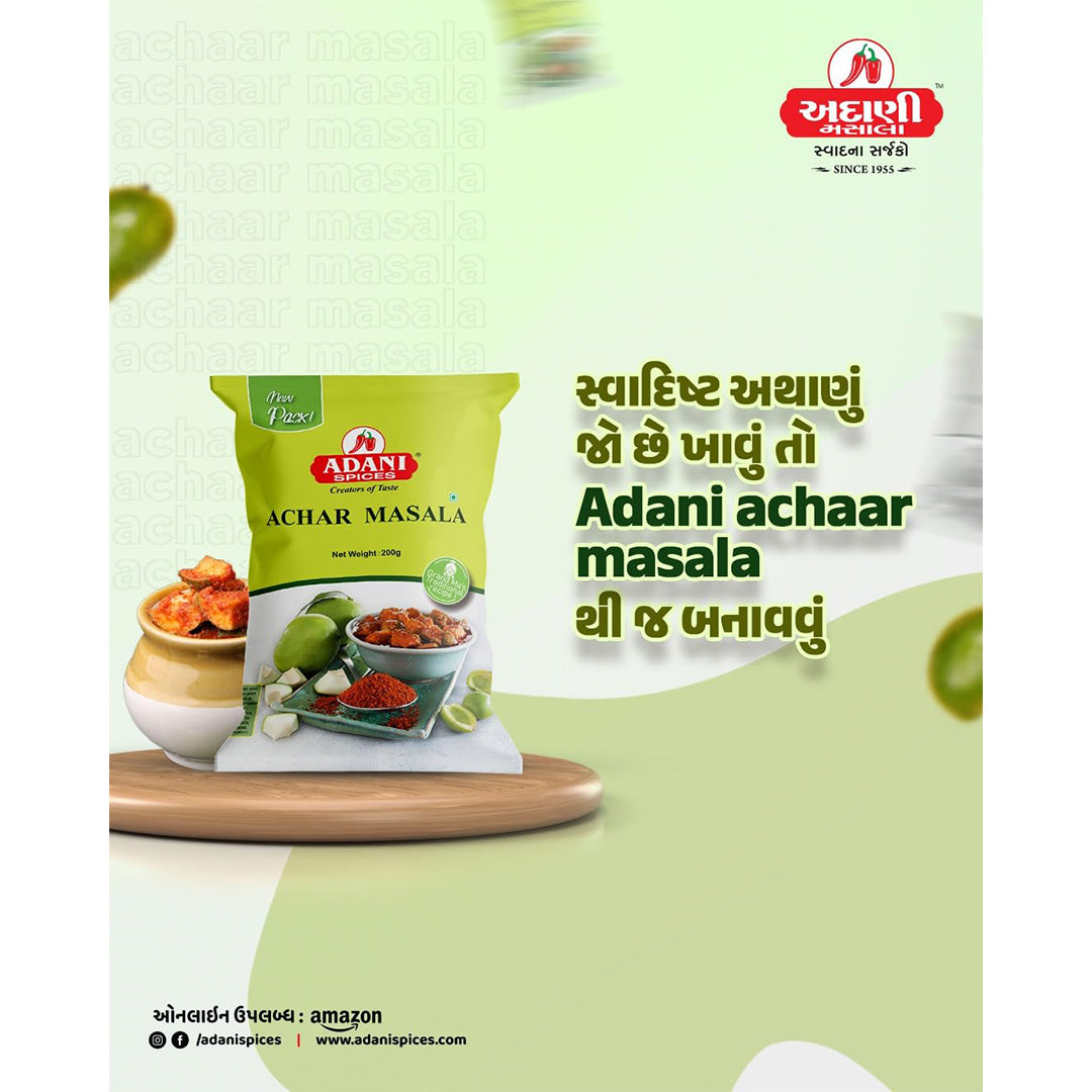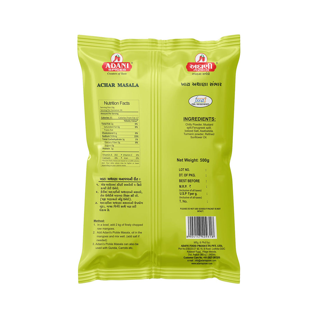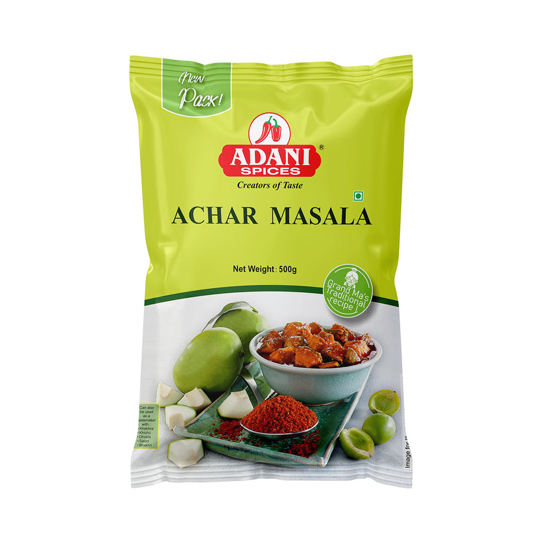 - Recipe for making Mango Pickle: Take 2.5 kg Raw mango in a small small pieces, add Adani Achaar Masala and mix it properly. Add Edible Oil & salt as per requirement. Now your tasty pickle is ready to serve. Achaar masala can be useful also for making Mango Gunda Pickle, raw vegetables, salad & with khakhra & other snacks also.